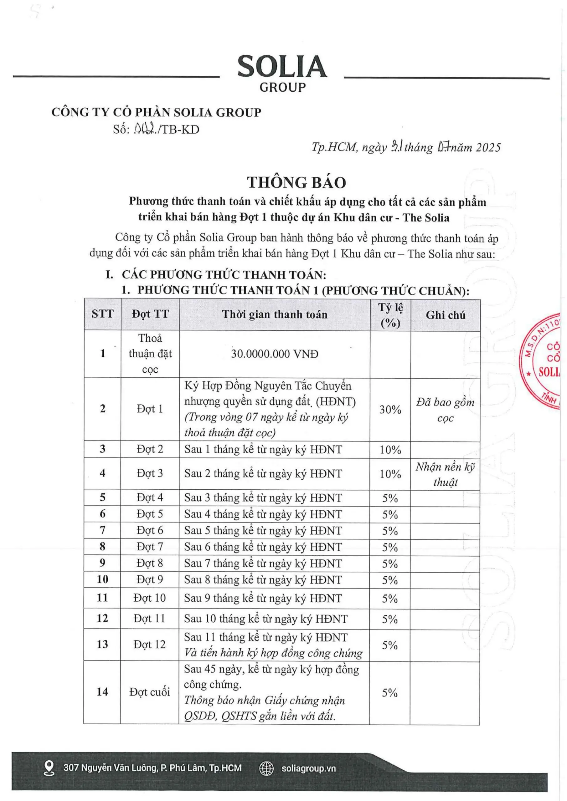 Lịch thanh toán và chính sách, giá bán tại The Solia (Cập nhật tháng 10/2025)