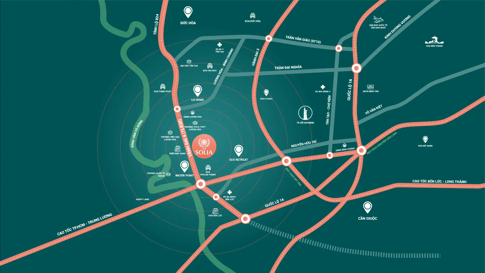 The Solia nằm ở vị trí trung tâm, kết nối trực tiếp với các khu công nghiệp trọng điểm của tỉnh Long An như Đức Hòa, Bến Lức và Cần Giuộc, là những vùng đang phát triển mạnh với hàng chục nghìn lao động và chuyên gia:
